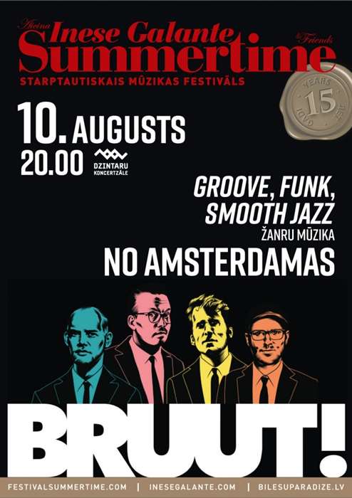Музыка стильного квартета из Амстердама BRUUT! в стиле Groove, Funkи Smooth Jazzвызывает ассоциации с культовыми фильмами Тарантино, виниловыми пластинками, которые всегда в тренде, и любимыми вестернами. Их солнечная, пропитанная амстердамским духом свободы музыка представляет собой особый коктейль в духе 60-х с примесью дэнс-музыки и сёрфа. Музыканты впервые выступят в Юрмале на юбилейном фестивале Инессы Галанте и докажут латвийской публике, что «BRUUT! придумали для танцев!». Они балансируют между узнаваемыми шлягерами и «необкатанной» импровизацией, соединяя в своих концертах музыку, под которую невозможно усидеть на месте, с такой, которую слушаешь затаив дыхание. В переводе с голландского название группы означает «жесткий», «брутальный», что в полной мере отображает силу энергетики, транслируемой их мощной музыкой, которую одним словом можно назвать «культовой».