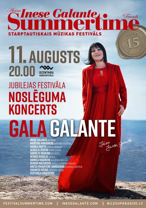 Гала-концерт международного музыкального фестиваля «Summertime – приглашает Инесса Галанте» — это светлая традиция и яркий праздник, которого каждый год с нетерпением ждут все поклонники и участники фестиваля. «Gala Galante» является не только кульминацией самого фестиваля, но и подводит итог всего музыкального сезона, оставляя приятное послевкусие воспоминаний о лете в Юрмале. В этом году гала-концерт «Gala Galante» будет еще более особенным, — в честь юбилея фестиваля Инессы Галанте организаторы подготовили специальную программу и массу сюрпризов. Зрителей ждут буря положительных эмоций и истинное музыкальное и эстетическое наслаждение: программа гала-концерта предусматривает разнообразие жанров — от любимой классики до удивительных музыкальных симбиозов, и, как всегда, яркий фейерверк новых, мощных и никого не оставляющих равнодушным музыкальных выступлений.